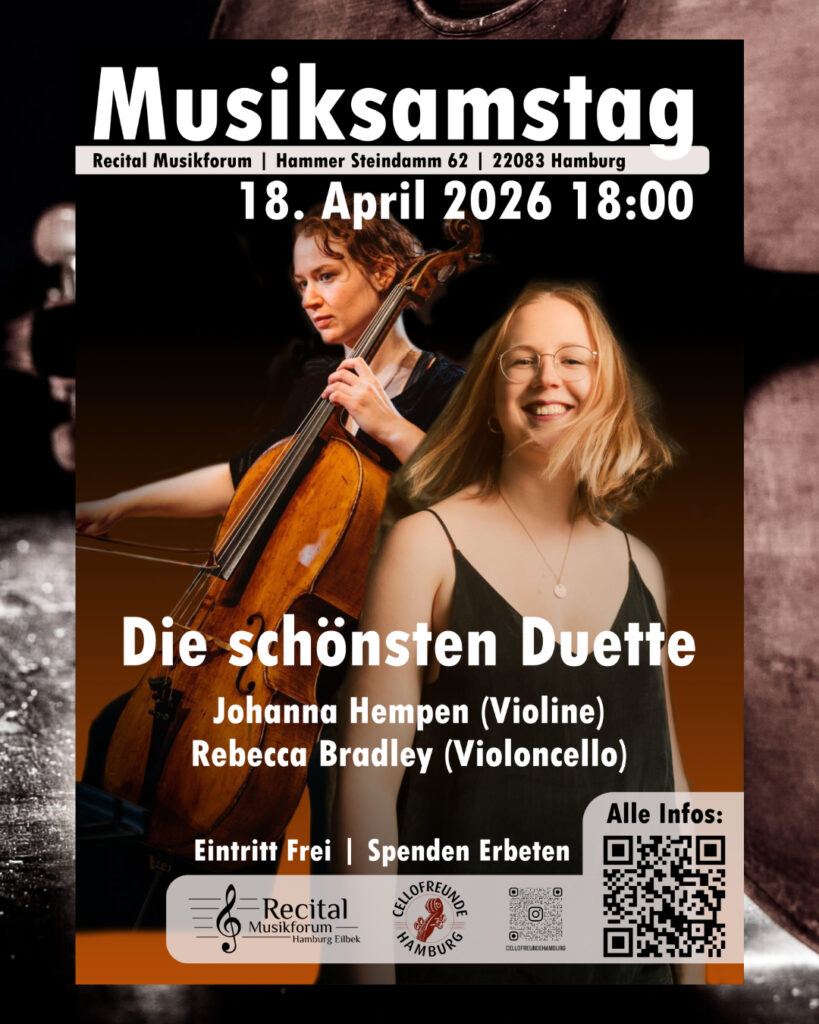 Rebecca (Cello) und Johanna (Violine) zeigen in ihrem Programm wie vielseitig man zu zweit klingen kann und spannen einen Bogen über Corelli, Bach bis hin zu Arrangements von Beethoven Klavierstück “Die Wut über den verlorenen Groschen” und Schuberts “Erlkönig”.